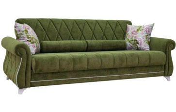 Диван оснащается мягкими фигурными боковинами, имеется вместительный ящик для хранения белья. Ткань: Велюр В (велюр). Состав: полиэстер (PES) 100%. Количество циклов истирания: более 25 000. Основные преимущества: высокая износостойкость и легкая чистка. В комплект входит 4 декоративных подушки: 2 валика и 2 цветные подушки. Большие зеленые подушки можно докупить отдельно.