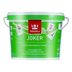 ---Описaние-Tikkurila Joker - это гипоаллергенная интерьерная краска с шелковистым эффектом. Применяется для окраски стен и потолков в сухих помещениях: гостиных, спальнях, детских комнатах, коридорах и в кухнях. Краска устойчива к влажной очистке и станет идеальным выбором для детской. Краска Tikkurila Joker образует красивую матовую поверхность с шелковистым эффектом. Она быстро сохнет, но оставляет достаточно времени на обработку поверхности без опасения появления «швов».-Общая информация--Производитель-Tikkurila-Модель-Joker-Тип-Для внутренних работ-Назначение-Для стен и потолков-Характеристики--Возможность колеровки-Есть-Степень блеска-Матовая-Цвет-Белый-Объем / Вес (л/кг)-2.7-Основа-Акриловая-Разбавитель-Вода-Время высыхания-до 2 чаcов при температуре 23°С и относительной влажностью 50%-Расход на 1 слой-10-12 кв. м. на 1 л на невпитывающие поверхности,7-9 кв. м. на 1 л на впитывающие поверхности-Способ нанесения-Валиком,Кистью,Распылением-Дополнительные характеристики--Особенности-Выдерживает чистящие химикаты и слабые растворители,Устойчивость к мытью-Дополнительно-Покрытие достигает своей окончательной твердости и стойкости приблизительно через месяц после окраски.Шелковистый эффект.Плотность: около 1,3 кг/л.-Упаковка--Размер упаковки (ВхШхД), см-20 x 20 x 16 см, вес 3.99 кг-Информация о производителе--Производитель-Tikkurila Oyj-Страна производства-Финляндия- None