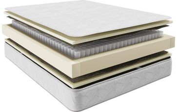 ЧЕХОЛ: Верхняя и нижняя пласть - ткань трикотажная стеганная, цвет белый, синтетическое нетканое волокно (холлофайбер) 200 гр, нетканый материал (спанбонд). Бурлет - ткань трикотажная стеганная, цвет белый, синтетическое нетканое волокно (холлофайбер), нетканый материал (спанбонд). Тесьма окантовочная матрасная, цвет белый. НАПОЛНЕНИЕ: Верхний слой — пенополиуретан стандартный h=30 мм. Независимый пружинный блок - 289 пружин на 1 м2, высота блока 140 мм. Защитный слой - войлок. Нижний слой - пенополиуретан стандартный h=30 мм. Отбортовка – пенополиуретан стандартный, h= 140 мм.