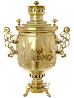 Тульский латунный самовар классической формы с изящным рифлением в виде листьев и ажурными витыми ручками. Труба для отвода дыма в комплекте. Наличные, VISA/Mastercard, б/н расчет Страна производства: Россия