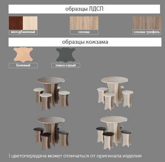 Обеденная группа тип 6 Цвет корпуса венге / дуб молочный, дуб сонома, дуб сонома трюфель Обивка сидений табуретов кожзам бежевый, темно-серый Стол, ШxВxГ (мм) 800x735x800 Табурет, ШxВxГ (мм) 330x394x330 None
