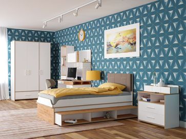 Молодежная мебель Вуди К2 (модульная) Цвет дуб крафт золотой / белый премиум / саванна латте / кромка "фанера" Размер - смотрите поэлементно Комплектацию можно менять и приобретать элементы серии по отдельности в любом количестве и сочетании Дизайн модульном системы Вуди раскрывает тему экологии в интерьере. Все декоры имитируют фанеру, окрашенную с лицевой стороны в белый цвет. Закруглённые углы мебели - это стильный приём и безопасность детей. В карман на изголовье кровати отлично поместится смартфон, а выкатная система хранения может служить дополнительной поверхностью для детских игр. None