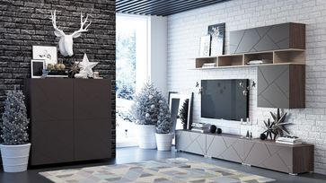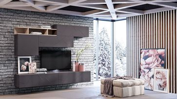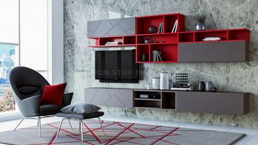 Подвесная гостиная SUMMIT (Саммит) К4 (модульная) Варианты изготовления: Фасад МДФ Summit Софт графит Каркас Ясень Анкор Темный / Ярко красный (полки) Размер 2404х416х2220h Ниша под тв 1800х900 (высоту можно менять в зависимости от навешивания верхних элементов) Комплектацию можно менять и приобретать по отдельным предметам в любом количестве и сочетании None