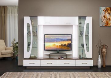 Стенка для гостиной Вита Шкаф МЦН 08.51 Корпус: ЛДСП 16 мм Орех Селект каминный; Белый премиум Фасады: МДФ 16 мм Белый глянец Размер Ш 2376 х Г 482, В 1815 мм Ниша под ТV: 1400 х 1004 мм Ручки пластик, цвет белый (вставка под золото). Распашные двери на четырёхшарнирных петлях. Выкатные ящики на шариковых направляющих.Верхние горизонтальные откидные двери на газлифтах. None