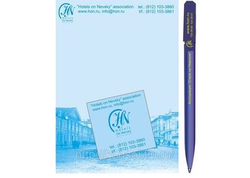 В набор входит: блокнот с нанесением вашего изображения 50 стр (148х105 мм), ручка с вашими данными (телефон, адрес), магнит с вашими данными (5х5 см). В качестве сувениров для ваших гостей предлагаем набор с логотипом, адресом и телефоном вашей гостиницы. Такой набор послужит хорошей рекламой для привлечения новых гостей. Стоимость: 100 экз — 79,1 р/набор, 500 экз — 60,1 р/набор, 1000 экз — 57 р/набор.