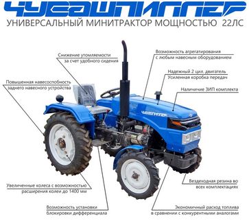 Минитрактор Чувашпиллер-220 SWATT является одной из самых популярных моделей на российском рынке. Данная модель хорошо зарекомендовала себя как в теплом южном российском климате, так и в суровом северном, за счет качественного проверенного временем 2-х цилиндрового двигателя TY-295 способного работать даже в сильный мороз. Трактор может быть оборудован блокировкой дифференциала (16000 руб.).Цена указана без учета доставки со склада в г. Чебоксары! Необходима предоплата 50%. Есть доставка.