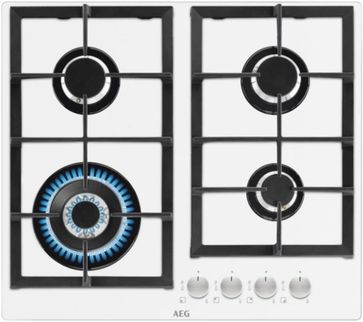 Варочная панель AEG HKR64440NW — четырехконфорочная модель белого цвета из серии «Газ на стекле». За стеклокерамической поверхностью  легко ухаживать, чугунные решетки хорошо отчищаются. Регуляторы находятся справа, подальше от мощной WOK-конфорки. Необходима предоплата 50%. Есть доставка.