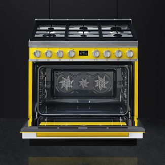 Варочный центр желтого цвета оснащен 6 газовыми конфорками, что позволяет приготовить сразу несколько блюд. Поворотные переключателями из нержавеющей стали, сочетаются по цвету с варочной поверхностью. Для каждого типа продуктов (мясо, рыба, овощи и т.д.) предусмотрена автоматическая программа притотовления. Также можно самостоятельно устанавливать время готовки, по истечению которого прибор отключится автоматически. В нижнем отсеке Push-pull можно хранить принадлежности.Тройная конвекция горячего воздуха помогает пропечь блюдо равномерно. Необходима предоплата 50%. Есть доставка.