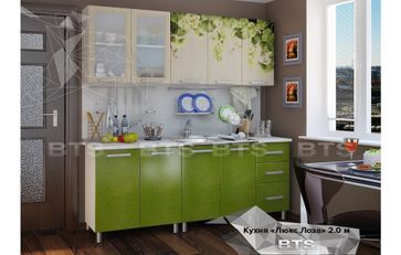 Кухня Лоза — Свежесть летней прохлады, которую можно почувствовать под ветвистой лозой сочного винограда, проникает в ваш дом вместе с кухней Люкс Лоза. Теплые, естественно природные оттенки наполнят ваш дом гармонией, счастьем и безмятежностью. Корпус: ЛДСП Белый Фасад: Фотопечать / МДФ "Зеленый лёд" Кухонный гарнитур Люкс Лоза комплектуется столешницей Антарес толщиной 26мм на каждый модуль по отдельности.