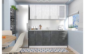 Кухня МДФ Эко — необычайно стильное и элегантное решение для обустройства кухонного пространства. В ней в равной степени сочетается шик и строгость, лаконичность, сдержанность и простота. Материал корпуса ЛДСП Белого цвета, фасадов МДФ Бетон снежный/Бетон графит, столешница Антарес толщиной 26 мм. В составе комплекта: •стол под мойку 800 2 двери (800х525х820) без столешницы, рекомендуемый размер накладной мойки 800х600,