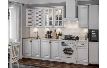 Кухня Престиж — мебель в стиле Прованс, создает атмосферу благополучия, стабильности и хорошего настроения. Кухня обладает существенным преимуществом: верхние шкафы имеют высоту 900 мм, что делает помещение выше и увеличивает место для хранения на 180 мм в высоту. Кухня Престиж предлагается гарнитуром, но при желании его можно дополнить модулями складской программы, ассортимент, габариты и цену которых для вас уточнят консультанты магазина. Корпуса модулей изготовлены из ЛДСП Белого цвета, фасад МДФ Шервуд жемчуг, столешница 26 мм толщиной в цвете Антарес. В составе комплекта: •стол 2 двери 800 (без столешницы, можно использовать под мойку) (800х600х824); •стол 2 двери / полка 800 со столешницей (800х600х850); •стол 1 дверь / полка / 1 ящик 400 со столешницей (400х600х850); •шкаф навесной 2 двери / 2 полки 800 (800х320х900) решетка; •шкаф навесной 2 двери / 2 полки 800 (800х320х900) стекло; •шкаф навесной 1 дверь / 2 полки 400 (400х320х900). Карниз в декоре фасадов навесных шкафов в комплектацию не включен и может быть приобретен дополнительно. None Страна производства: Россия Есть доставка.