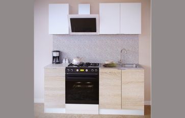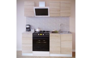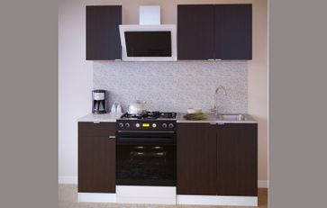 Прямой кухонный гарнитур ПН-04 + ТК-04.1 + ПН-08 + ТК-08мКухонный гарнитур для маленькой кухни. В комплекте есть все необходимые модули для хранения посуды, столовых приборов и аксессуаров для готовки. Ширина гарнитура с учетом установки плиты и вытяжки — 1800 мм. Размеры элементов: