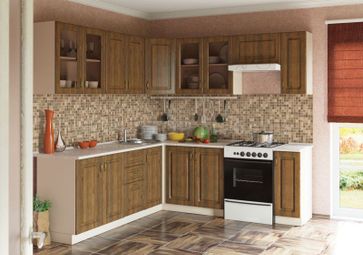 Кухня Эмили угловая 2200х2300 (модульная) Размер 2200х2300х2170 Фасад Эмили МДФ 16 мм ель, орех кантри Столешницы 38мм (толстые) на выбор В витринах тонированное стекло Ручки: металл (старое золото) Комплектацию, компоновку и размер можно менять на ваше усмотрение в пределах элементов серии + возможны изменения корпусов при сборке None
