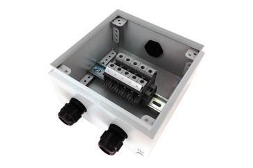 Основные параметры клеммной коробки: Стальной корпус 200х200х120мм. Установлено 5 клемм. Минимальное сечение провода для клемм 1,5мм2. Номинальное сечение 35мм2. Максимальное сечение 50мм2. Максимальный ток 150А 1000В. Установлено 3 кабельных ввода: 2шт для кабеля внешним диаметром 13-18мм, 1шт для кабеля диаметром 18-24мм.