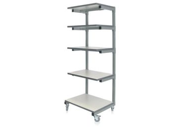 Имеет пять полок. Изготовлен из металлического профиля с порошковым покрытием. Снабжен регулировкой по высоте каждой полки и колесными опорами с механизмом фиксации.
