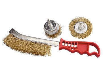 Набор металлических щеток изготовлен из стальной проволоки. Латунное покрытие. Применяется для очистки металлических поверхностей от ржавчины и грязи в щадящем режиме. None Страна производства: Китай