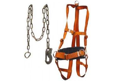 Предохранительный пояс с наплечными и набедренными лямками со стропом из цепи с амортизатором.