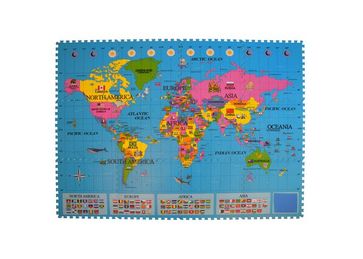 Размер игрового поля с кромками 120*90 смИзображены все континенты, основные страны и их флаги.Упакован в полиэтиленовую сумочку на молнии.Высококачественная термопечать рисунка. не имеет запаха, покрытие абсолютно безвредно и экологично;быстро и легко укладывается и так же легко разбирается;создаёт эффект "тёплого пола";покрытие стойко к бытовой химии и влаге, легко чистится и моется; Кромки по краям снимаются, что дает возможность расширять игровую зону, добавляя плитки из других подобных наборов и плитки мягкого пола, пока хватит фантазии.