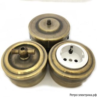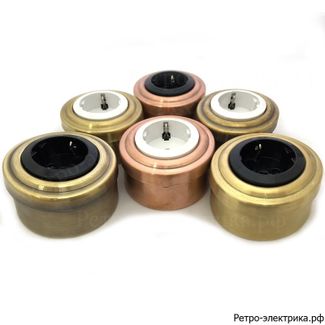 Электроустановочные изделия из металла наружной установки от АСР-СЕРВИС. Электроустановочные изделия ретро выключатели, розетки, коробки наружной установки с проводом ретро серии Царский Стиль. Электроустановочные изделия наружной установки из металла цветом Бронза (Розетка с з.к., металл, Белая/Бронза;Выключатель поворотный, 1кл, проходной, металл, цвет Бронза), Золото, Медь, металл крашенный Чёрного цвета, Патинированный. Оставляйте заявку на сайте: ретро-электрика.рф или приходите в гости в магазин ретро электрики.