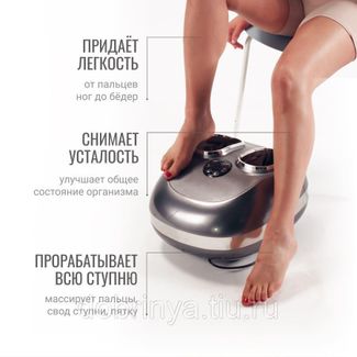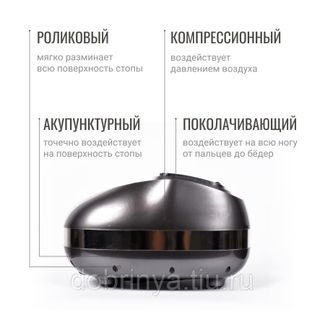 Массажер для ног c усовершенствованной системой массажа всей стопы. Принцип работы массажера основан на встроенных массажных роликах, акупунктурных пластинах и воздушно-компрессионных подушках. Все массажные механизмы предназначены для тщательной проработки сразу всей стопы (свод стопы, пальцы, пяточную область)