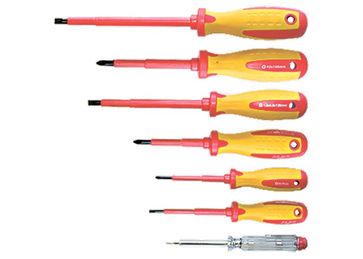 Набор диэлектрических отверток с пробником предназначен для монтажа и демонтажа деталей и элементов конструкции, находящихся под напряжением до 1000 В. В комплект входят отвертки c профилями SL1.2 x 6.5 x150 мм, SL 1.0 x 5.5 x 12 мм, SL 0.5 x 3.0 x 80 мм, РН №0 х 75 мм, РН №1 х 75 мм, РН №2 х 100 мм, отвертка-пробник (напряжение 120–250 В). Отвертки имеют стержень с намагниченным наконечником и двухкомпонентную рукоятку эргономичной формы. None Страна производства: Тайвань