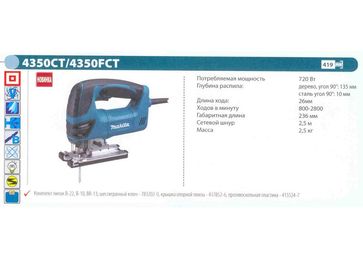 - Лобзик электрический MAKITA 4350CT (720Вт, 135 мм, рег.об, маят.ход, 6 пилок, 2.5 кг, кейс) по выгодной цене 5 900 р. руб.;