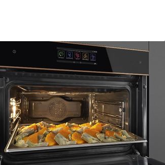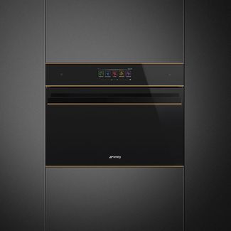 Компактный многофункциональный духовой шкаф, комбинированный с пароваркой, SmegConnect, 60 см, высота 45 см, 15 функций, черное стекло Eclipse, профиль медный. Необходима предоплата 50%. Есть доставка.