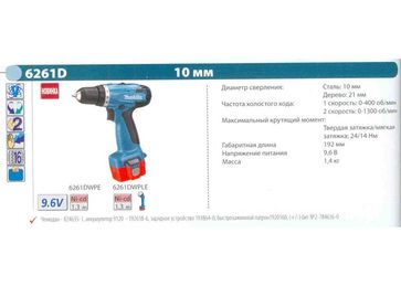 - Дрель аккумуляторная MAKITA 6261 DWPE (9.6V, БЗП-10мм, 24Нм, 1.5кг, 2ск, 2акк-1.3Ач, кейс) по выгодной цене 3 350 р. руб.;