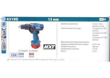 - Дрель аккумуляторная MAKITA 6319 DWAE (12V, БЗП-13мм, 3 ск, 65Нм, 2.2кг, 2акк-2А ч, кейс) по выгодной цене 7 950 р. руб.;