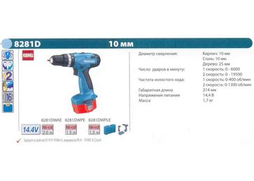 - Дрель аккумуляторная ударная MAKITA 8281DWPE (14.4V, БЗП-13мм, 2ск, 36Нм, 2 акк-1.3А ч, 1.7кг, кейс) по выгодной цене 4 900 р. руб.;
