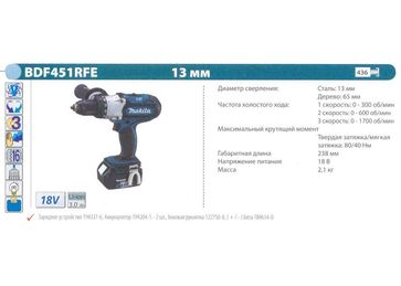 - Дрель аккумуляторная ударная MAKITA BDF451RFE (18В, БЗП-13мм, 3ск, 80Нм, 2.2кг, 2акк.Li-ion-3А ч, кейс) по выгодной цене 12 700 р. руб.;