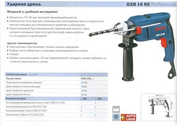 - Дрель ударная BOSCH GSB 1600 RE (0601218121) (701Вт, БЗП-металл-13мм , рев, 1.9кг) по выгодной цене 3 700 р. руб.;