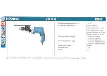 - Дрель ударная MAKITA HP2050 (720Вт, 2ск 0-1200 2900об мин, ЗВП-13мм, рев, 2.3кг, кейс) по выгодной цене 3 990 р. руб.;