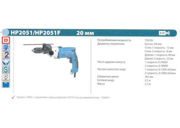 - Дрель ударная MAKITA HP2051F (720Вт, 2 ск, рев., БЗП, рег.кейс, 2.3кг) по выгодной цене 4 350 р. руб.;