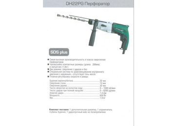 - Перфоратор SDS-plus двухрежимный HITACHI DH22PG (620Bт, SDS-plus, 2реж, рег.обор, кейс) по выгодной цене 3 750 р. руб.;
