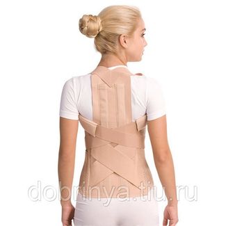 выполнен из "дышащего" материала с высоким содержанием хлопка, не вызывает аллергии и раздражения кожи; имеет 2 длинных моделируемымых ребра жесткости на грудной и поясничный отделы позвоночника, снабжен 2-мя короткими на поясницу и мягкой поясничной подушкой для обеспечения дополнительного комфорта; комплекс динамических лямок и стяжек обеспечивают поэтапную коррекцию нарушенной осанки и снимают напряжение с мышц спины; комфортен для использования в любое время года.