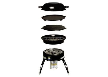 5 независимых поверхностей для приготовления: гриль-решетка, сковорода, антипригный гриль с ребрами, антипригарная плита-гриль, горелка, чехол-сумка, используется с газовым катриджем.
