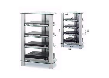 Стойка под ТВ и Hi-Fi компоненты, 5 полок, высота 95 см, ширина 61 см, стойки квадратного сечения - алиминий, стекло - прозрачное, изменяемая высота установки средних полок. None