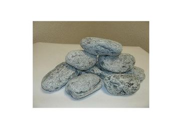 Камень вулканической породы талькохлорит обвалованный.Крупная(до 150мм) и мелкая(до 70мм) фракция.Картонная упаковка по 20 кг.