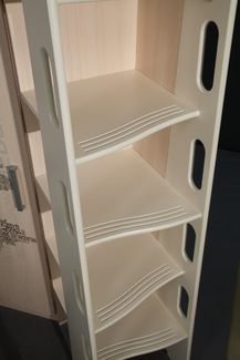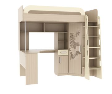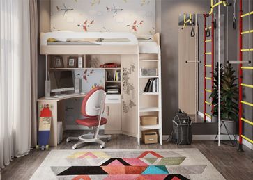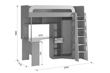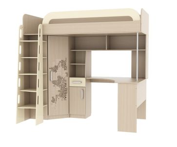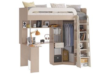 Комплекс из стола, шкафа для одежды, полок и спального места. Универсальная сборка — можно собрать на обе стороны. Ступеньки сделаны так, чтобы нога не скользила.
