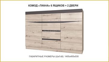 Комод широкий 2 двери 6 ящиков Тиана Цвет Дуб Бонифаций/Вольфрам Размер (ШхГхВ): 1495х400х930 мм Можно дополнить другими элементами серии Тиана Комод 5 ящиков Тиана изготовлен из комбинированного ЛДСП в цвете Дуб Бонифаций / Вольфрам. В верхней, фасадной части комода закреплен элемент из МДФ в цвете Смоки Софт. Комод оснащен пятью выдвижными ящиками на шариковых направляющих, длиной 350 мм. Дополнить комод возможно модулями из серии Тиана None