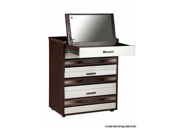 Комод Валенсия 35.09 Дуб Венге \ Синга крем + вставки стекло 680450850мм В верхнем ящике находится откидное зеркало 1. Описание: Небольшой, но вместительный комод «Валенсия 35.09» является частью модульного набора для гостиной «Валенсия». Особенност