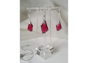 Комплект: серьги и кулон на цепочке. Материалы: кристаллы Swarovski, фурнитура (качественный бижутерный сплав), бейлы из серебра 925 пробы (Sterling Silver). Цвет рубиновый, прозрачные кристаллы.