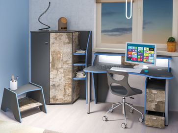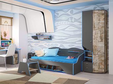 Комплект детской мебели Индиго К2 (модульная) Размер - смотрите поэлементно Цвет темно-серый / граффити / Комплектацию можно менять и приобретать элементы в любом количестве и сочетании Для тех, кто ценит индивидуальность и не боится быть уникальным - предлагается молодёжная модульная система Индиго. Здесь нестандартно всё: геометрические формы, стиль, декоры. Такая мебель может стать акцентом в любом интерьере. Компьютерный стол имеет поддержку для локтей, светодиодную подсветку и подготовлен для укладки проводов компьютера (в столешнице предусмотрены заглушки). Кровать имеет вместительную выкатную систему хранения, светодиодную подсветку, функциональные приспинные полки. Часть деталей выполнена из ЛДСП толщиной 22 мм в ПВХ кромке толщиной 2 мм. Это надёжно и эстетично! None