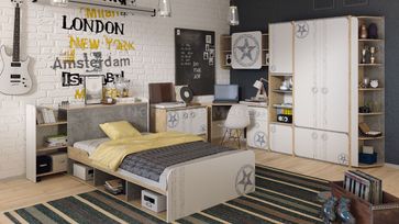 Комплект детской мебели Мегаполис №2 (модульная) Цвет Бунратти/Белый с рисунком размер - смотрите поэлементно Спальное место 800х2000 Комплектацию можно менять и приобретать элементы серии по отдельности в любом количестве и сочетании В коллекции «Мегаполис» всё продумано до мелочей. Элегантные ручки повторяют форму фасадов, привнося гармонию в интерьер помещения. На фасадах с одной стороны имеется прямой угол, а с другой стороны угол мягко скошен и это вносит нотку изящества в обстановку. В коллекции представлен большой ряд модулей, с помощью которых Вы сможете обустроить комнату, исходя из своих потребностей. Есть возможность обустроить и место для отдыха, и место для учёбы или хобби. Вместимость модулей обеспечивает для Вас большое количество мест для хранения None