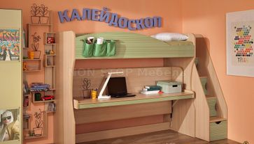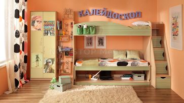 Комплект мебели для детской Калейдоскоп - композиция 6 Цвет корпуса дуб отбеленный Цвет фасадов на выбор лимон, серый, зеленая радуга, серая радуга Размер 3902х1200х2088 Вы можете составить композицию на ваше усмотрение, по размерам и наполнению из элементов представленных на изображении №4, стоимость элементов уточняйте по телефону, через форму обратной связи или почту nonstopmebel@yandex.ru Матрас в стоимость не входит Матрас приобретается отдельно на выбор Детям всегда нужно как можно больше места для игр, особенно, когда их двое. Кровать-Трансформер 2 полноценная двухъярусная кровать и рабочее место на площади всего в 1,9 кв.м., тогда как отдельно стоящие две кровати и стол займут намного больше места. Кровати-Трансформеры оснащены инновационным, специально разработанным для данных моделей кроватей, механизмом трансформации. Даже ребёнок может перевести кровать в положение «Стол» и обратно. Газовый механизм с усилием в 800 Ньютонов обеспечит лёгкость хода, а фиксаторы надёжно удержать Кровать-трансформер в выбранном положении. В положении «Кровать» расстояние от столежницы до спального места составляет 329 мм. Это позволит при смене положения Кровати из «Стола» в «Кровать» оставить на столешнице всё как есть. Все кровати коллекции с дном из ЛДСП, поэтому их необходимо использовать исключительно по предназначению, то есть для сна. Во избежание повреждения конструкции кроватей не допускается их использование в качестве спортивного тренажёра или батута. Устойчивая прикроватная Тумба-лестница с высокими перилами обеспечивает безопасный спуск и подъем даже маленькому ребенку. Ступени служат дополнительным местом для хранения игрушек. Под нижней ступенькой располагается вместительный выкатной ящик на роликах. Стеллаж Twist с ассиметричными полочками станет изюминкой детской Вашего ребёнка. Его можно навесить на стену, на стенку глубокого (581 мм) или неглубокого (373 мм) шкафа и разместить на нём яркие аксессуары. Стеллаж Twist несёт исключительно декоративную функц