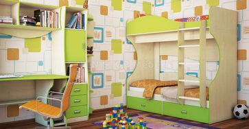Кровать двухъярусная Комби МН-211-06 Цвет береза / лайм Размер 1950х1000х1830 Спальное место 800х1900 Возможно дополнить элементами из серии Комби Матрас в стоимость не входит Матрас вы можете приобрести отдельно у нас на выбор: беспружинные матрасы, матрасы с зависимыми пружинами (пружинный блок боннель) или независимыми пружинами, средней жесткости и с усилением, с различным наполнением (латекс, кокос, зима лето и другие варианты и их сочетания) Детская «Комби» это свежее решение в тенденциях современности. Цветовая гамма универсальна, как для мальчиков, так и для девочек. Цвет лайм- цвет жизни, создает идеальное условие для игр, учебы и отдыха детей. Используя возможность модульности, легко создать новую компоновку мебели. Модули не крепятся друг к другу, поэтому при желании можно менять их местами - создается постоянный так называемый "эффект новизны". Для экономии пространства кровати оборудованы выдвижными ящиками, дополнительным спальным местом. В «Комби» мы воплотили все: элегантность форм, сияние цвета, большой модульный ряд и все это в сочетании с практичностью и комфортом. None