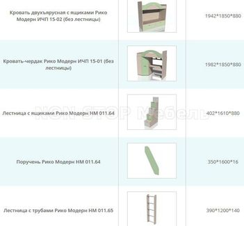 Набор мебели Рико ЛДСП Ирис/Модерн компл 1 Фасад: ЛДСП Ирис, аква, зеленый, коралл, дуб тортона Каркас: ЛДСП Дуб Девонширский Размер - смотрите поэлементно Возможно изменение композиции и приобретение по отдельным предметам Указана цена за вариант представленный на изображении (без учета матраса - приобретается дополнительно на выбор), который вы можете изменить на ваше усмотрение, составив необходимую вам композицию по размерам и наполнению из элементов представленных на изображении №№2 - стоимость элементов уточняйте по телефону, через форму обратной связи или почту nonstopmebel@yandex.ru Комплектация: ИЧП 15-01 М1 (отдельно комплектуется матрацем 800*1900) НМ 011.64 Лестница с ящиками НМ 011.64 Поручень НМ 009.06 М Шкаф для книг НМ 013.71-03 Комод Цвет Коралл снят с производства! None