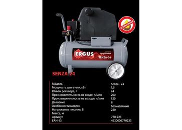 - Компрессор ERGUS SENZA-24 (200 120 л мин, 24л, 1.5кВт, 8бар, 24кг) безмасляный по выгодной цене 4 300 р. руб.;