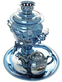 Комплект из трех предметов:латунный самовар, металлический поднос и заварочный чайник. Оборудован функцией автоматического отключения при закипании воды. Наличные, VISA/Mastercard, б/н расчет Страна производства: Россия